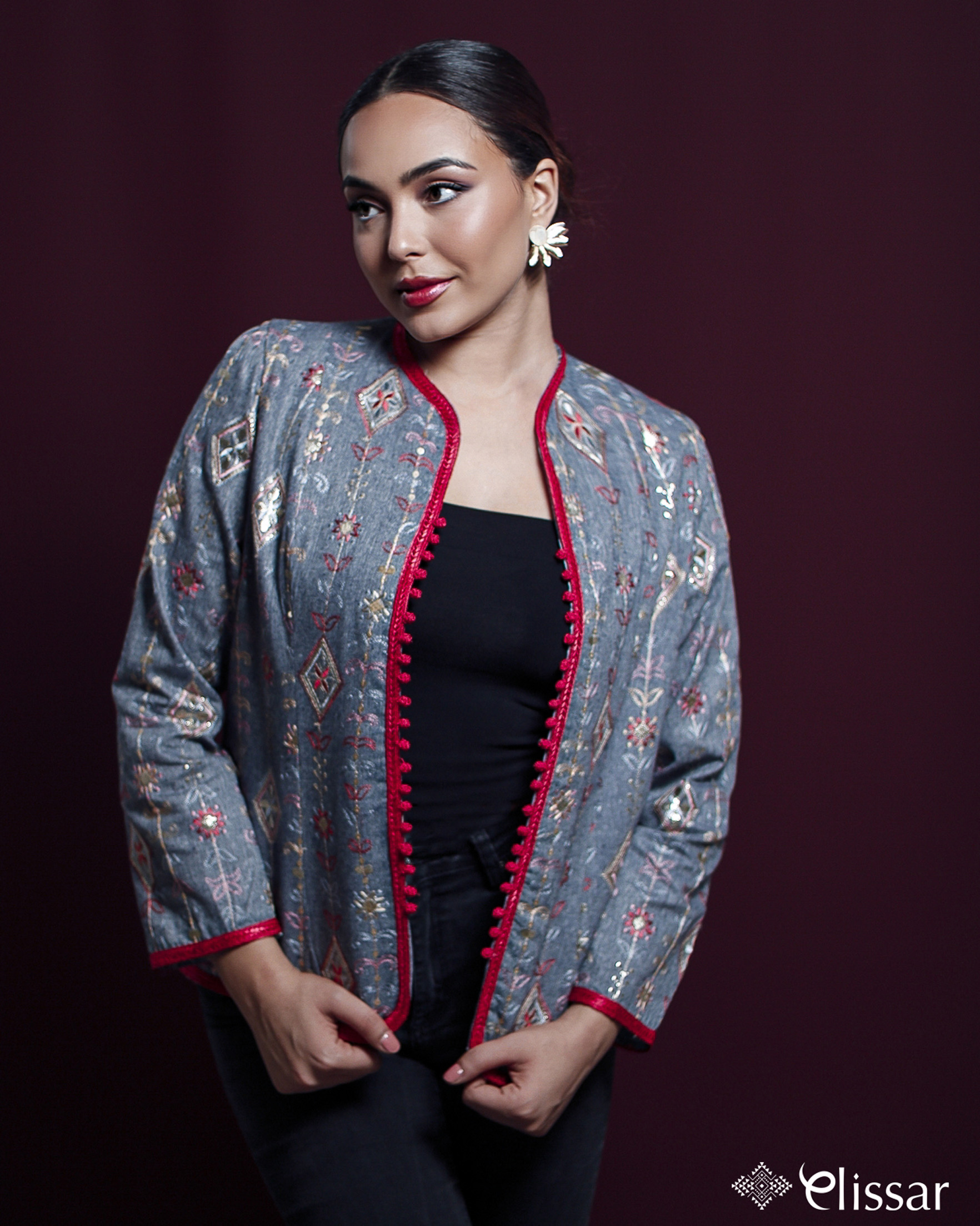 | Originalité : Le blouson Elissar se distingue par ses couleurs et broderies qui en font un blouson original et unique. | Classe: Sur un jean, une jupe ou une robe, le blouson Elissar, riche de ses tissus et broderies, se porte l’après-midi ou en soirée. |