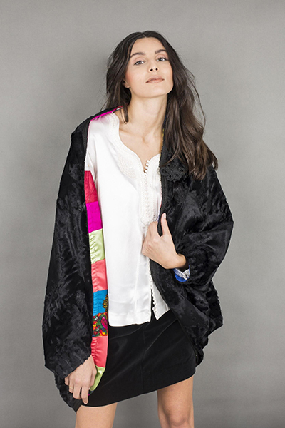 Une pièce contemporaine qui marie des tissus de textures et couleurs différents: l’élégance de la fourrure et le raffinement de la soie.