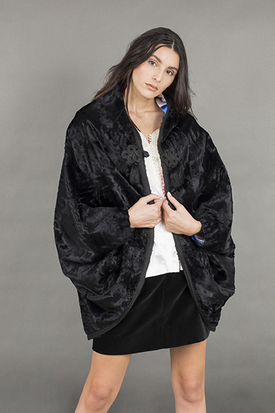 Une pièce contemporaine qui marie des tissus de textures et couleurs différents: l’élégance de la fourrure et le raffinement de la soie.